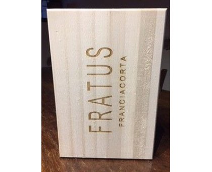 Cofanetto in stile bauletto in legno da 1 posto bottiglia, con logo "Fratus Franciacorta" e chiusura dorata.